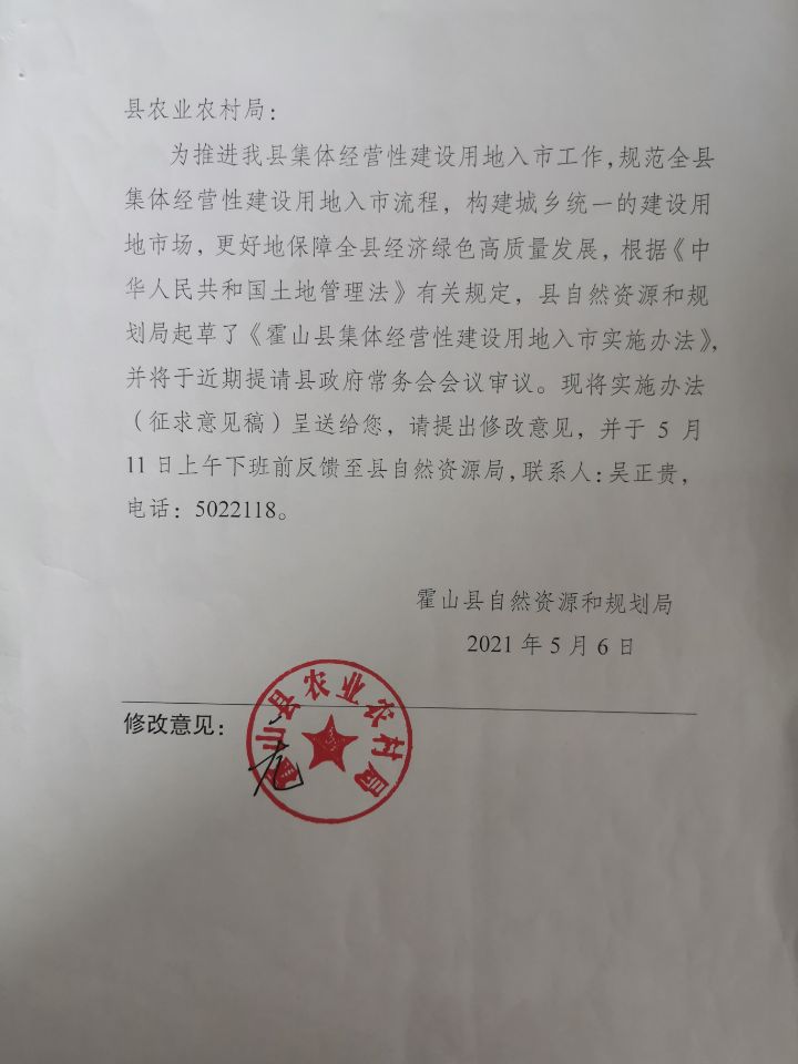 为推进我县集体经营性建设用地入市工作,规范全县集体经营性建设用地入市流程,构建城乡统一的建设用地市场,更好地保障全县经济绿色高质量发展,根据《中华人民共和国土地管理法》有关规定,县自然资源和规划局起草了《365bet娱乐场下载_365bet手机注册_体育外围app网站365集体经营性建设用地入市实施办法》,并将于近期提请县政府常务会会议审议。现将实施办法(征求意见稿)呈送给您,请提出修改意见,并于5月11日上午下班前反馈至县自然资源局,联系人:吴正贵,电话:5038096。