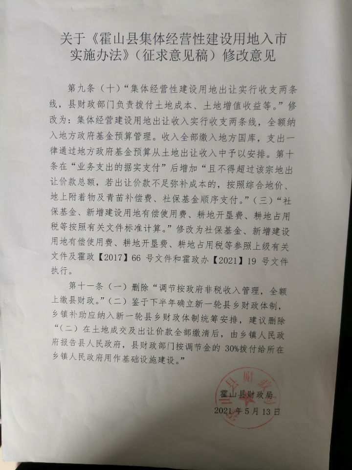 经赴外地考察学习集体经营性建设用地入市审批、模式、主体、程序、收益分配方案、出让收入监管等内容后,县自然资源局起草了《办法(征求意见稿)》,5月12日,召开了由县司法局、财政局、农业农村局、税务局、公共资源交易中心、佛子岭镇、下符桥镇、落儿岭镇等分管负责同志参加的征求意见会,会后进行了认真修改。县司法局进行了合法性审查后,形成提交县政府常务会议研究的《办法(草案)》。