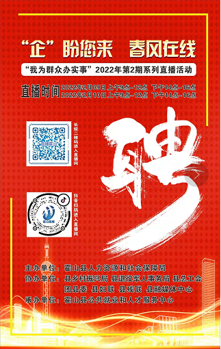 为切实解决劳动者求职难、企业用工难问题,我县将于2月9日、10日(正月初九、初十)通过网络直播形式举办2022年“春风行动”暨“就业援助月”企业用工招聘会。