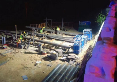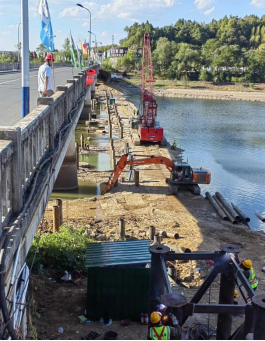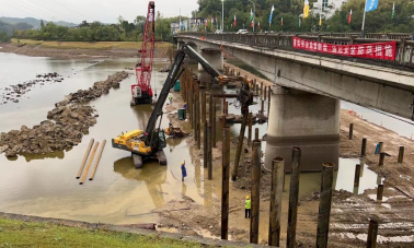 S332迎驾大桥危桥改造工程施工现场机器轰鸣,挖掘机、打拔机、装载车等各类工程车来回穿梭,工人们各司其职,一派忙碌景象。据施工方介绍,目前工程正在进行临时支撑体系建设,包括钢管桩打桩、横、斜撑标准支架焊接等。“我们今天投入机械7台,有挖掘机、振动锤、履带吊等,施工人员30余人,按照‘两班倒’作业方式,每天6点上工,干到晚上10点,做到‘晴天大干,雨天巧干,夜间挑灯干’。在施工过程当中,我们精心组织、科学施工,同时采取了新工艺、新方案,确保我们的施工进度按期完成,我们还制定了两个时间节点,首先在今年年底,我们将完成临时支撑体系及龙门吊安装,然后到明年的5月份,我们将完成主体工程”,现场负责人陈雪松介绍道。