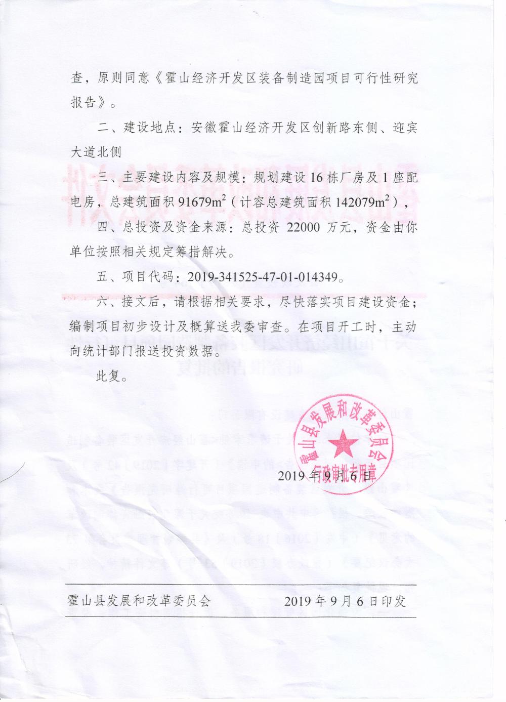 关于霍山经济开发区装备制造园项目可行性研究报告的批复