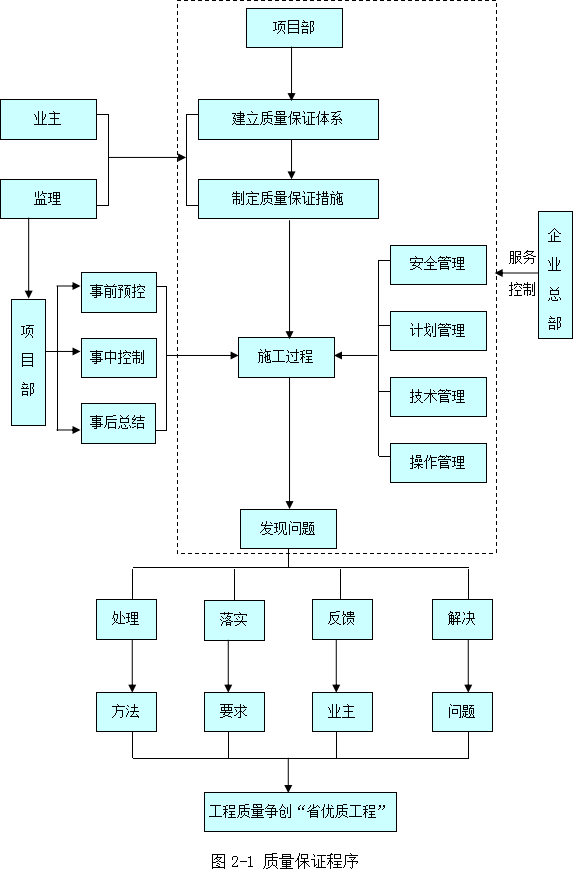 为了保证本工程质量目标争创“省优质工程”的顺利实现,专职人员建立统一协调组织机构,统一思想、统一协调,积极解决施工过程中的问题,保证质量目标顺利实现。