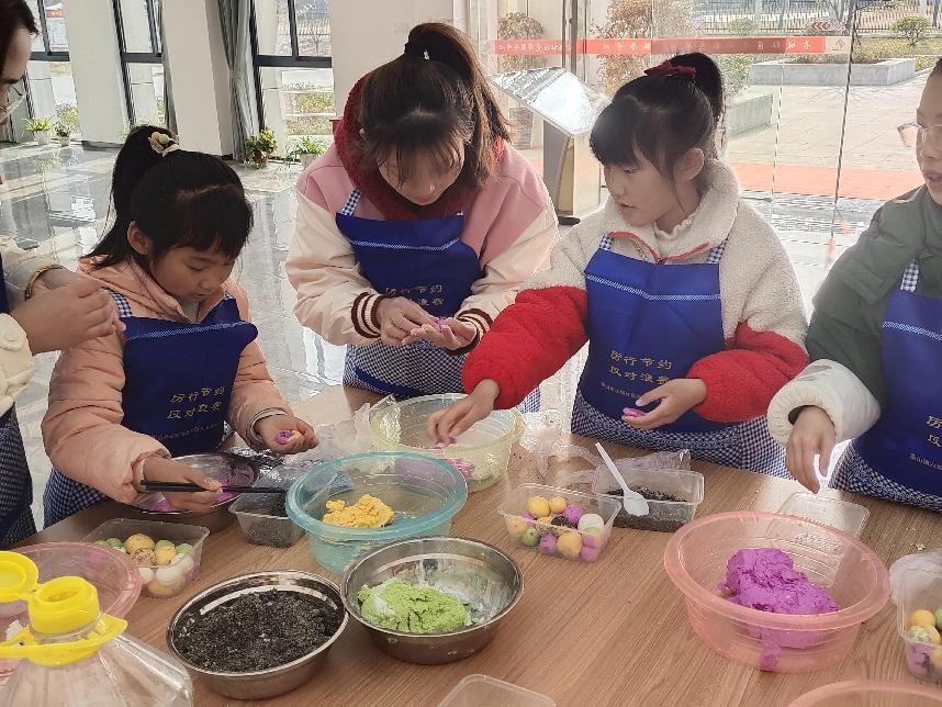 接下来,社区工作者拿出了准备好的菠菜汁、火龙果汁、南瓜汁调制的糯米粉和黑芝麻馅,给小朋友们分发好手套,大家就开始做起了元宵。小朋友对彩色的面团爱不释手,在家长和社区工作者的指点下,小朋友慢慢掌握了做元宵的技巧,纷纷比拼谁做得更圆。